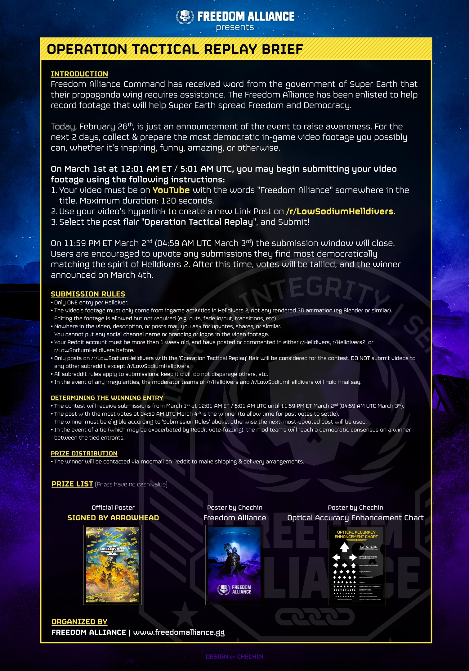 - Only posts on /r/LowSodiumHelldivers with the ‘Operation Tactical Replay’ flair will be considered for the contest. DO NOT submit videos to any other subreddit except /r/LowSodiumHelldivers